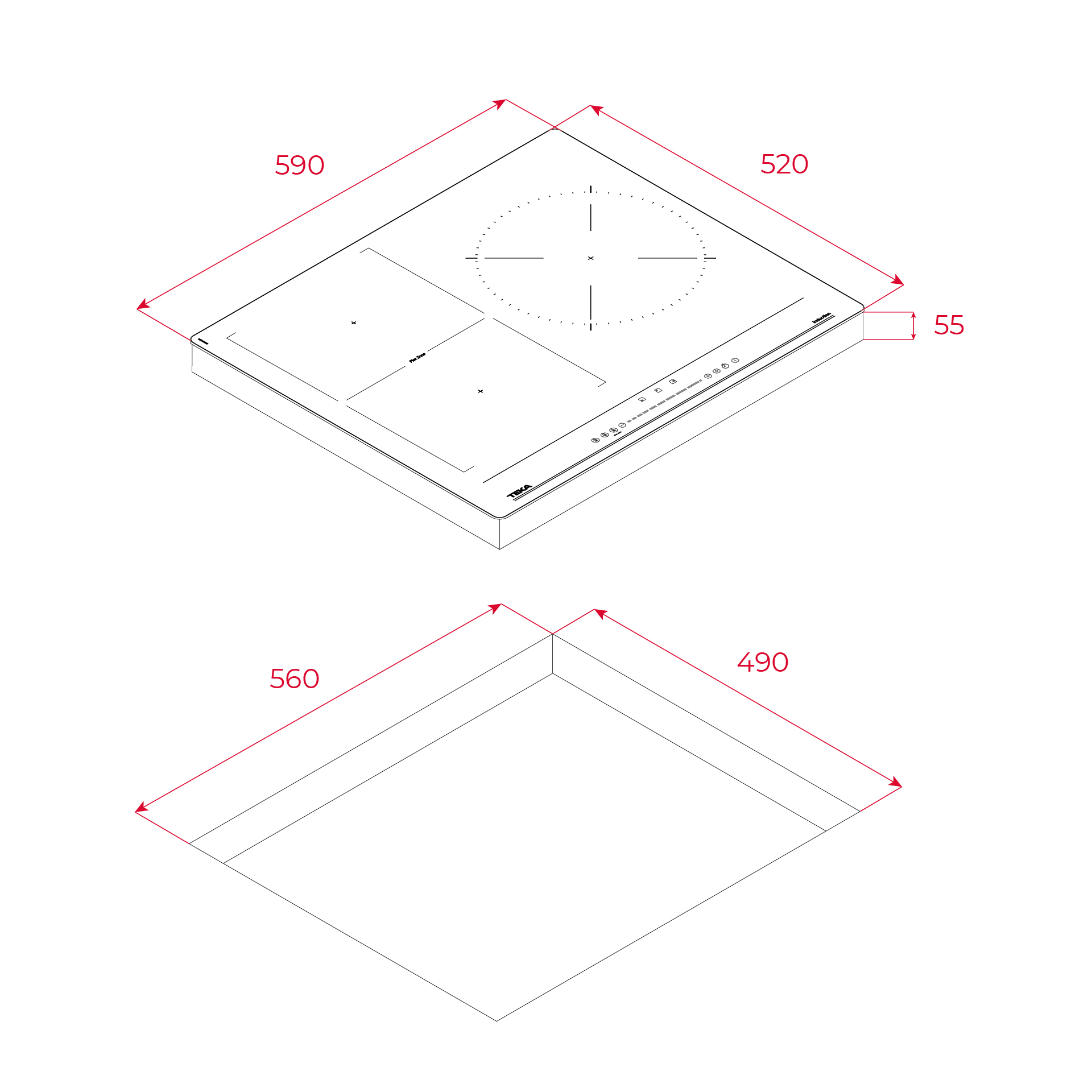 2 / 3 зони за готвење: 1 зона FLEX 180/360 mm (комбинирање на 2 зони 180 x 180 mm), 1 зона (Ø 300 mm)