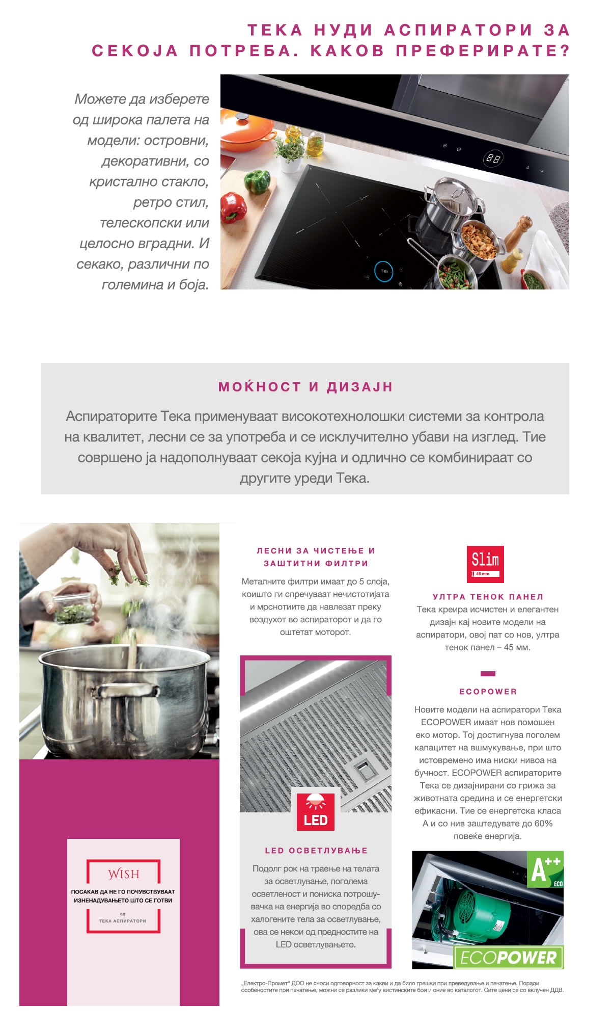 Електро-Промет е ексклузивен претставник и официјален дистрибутер за Р.Македонија на Германскиот бренд ТЕКА -аспиратори за кујни, апарати за вградување, садопери, чешми и италијанскиот бренд NARDO (економичена линија на апарати) Воедно е увозник на полски бранд NOWY STYL за канцелариска опрема. На своите потрошувачи им нуди производи со висок квалитет и извонреден дизајн со што ги задоволуваат и најприбиливите вкусови. Електро-Промет е компанија со висок рејтинг и реноме е една од водечките компании во продажбата на апарати за домаќинство (бела техника) во Македонија.